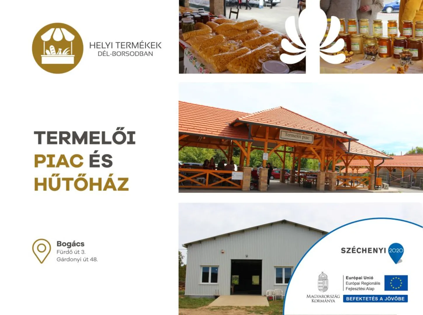 Termelői piac és hűtőház épült Bogácson a Helyi termékek piacra jutását segítő fejlesztések a Dél-Borsodi térségben című, TOP-1.1.3-15-BO1-2016-00012 azonosítószámú, konzorciumban megvalósult pályázat keretében.